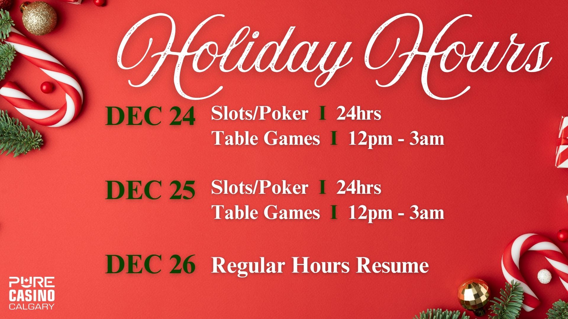 If you haven’t been able to stop by, we’re excited to have you. If you’ve already visited, we hope you had a great time at PURE Casino Calgary and enjoyed all the amenities at our casino. Our slots and poker room are open 24-hours, 7 days a week. From our Baccarat and Blackjack tables to our VIP lounge, we strive to provide the most luxurious and enjoyable gaming experience for all our guests.  We appreciate you choosing to spend your time with us here at PURE Casino Calgary, and we hope to see you again soon!
