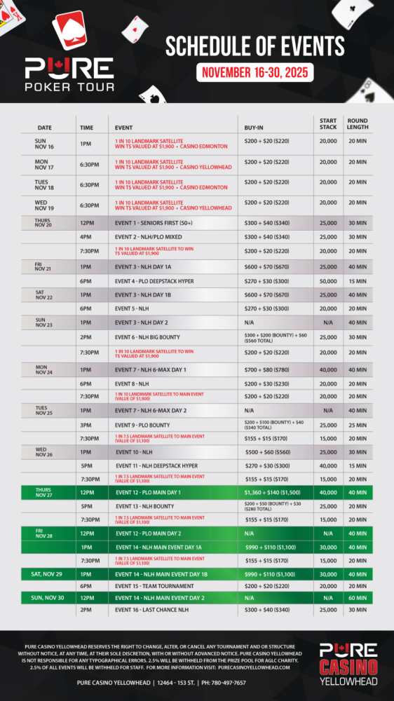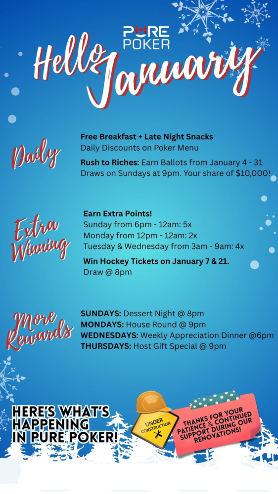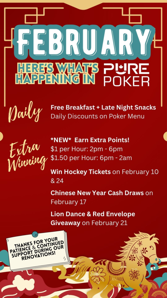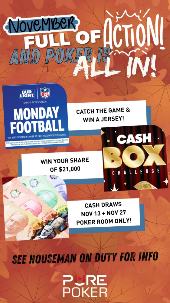 We offer both weekly and monthly poker tournaments and progressive promotions. Experienced dealers and floor staff are committed to providing excellent service for all players. So come check out Calgary’s BEST poker room at PURE Casino Calgary!